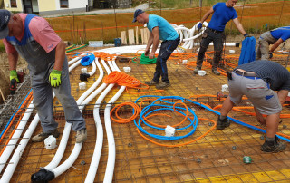 Pasivna hiša R - Razvod elektro inštalacij v plošči nad kletjo Po končanem razvodu prezračevanja je na vrsti elektro inštalacija. Najprej je potrebno točno pozicionirati vse doze za vgradne in nadometne luči. Tu je natančnost zelo pomembna, saj se vse napake potem vidijo v prostoru. Vse objekte delamo brez spuščenih stropov, da se [...]