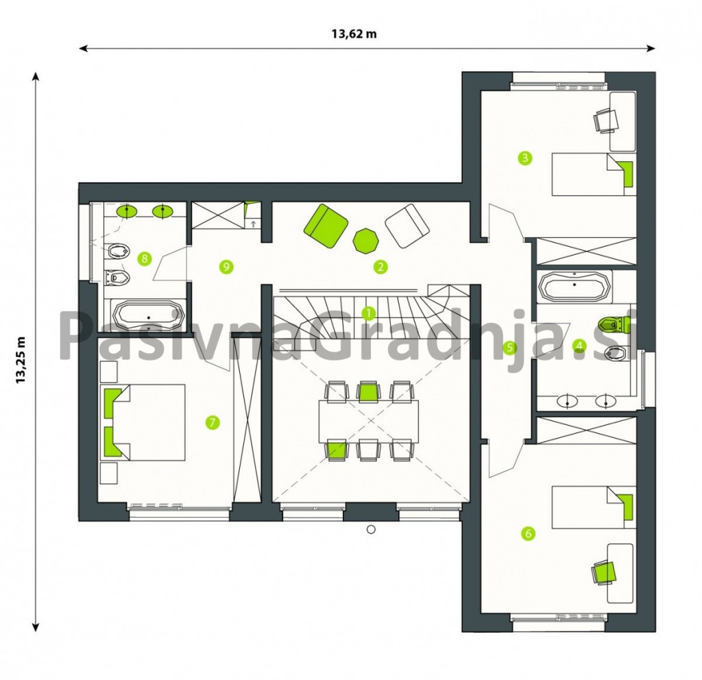 - Tlorisni gabarit: 13,25 x 13,62 m