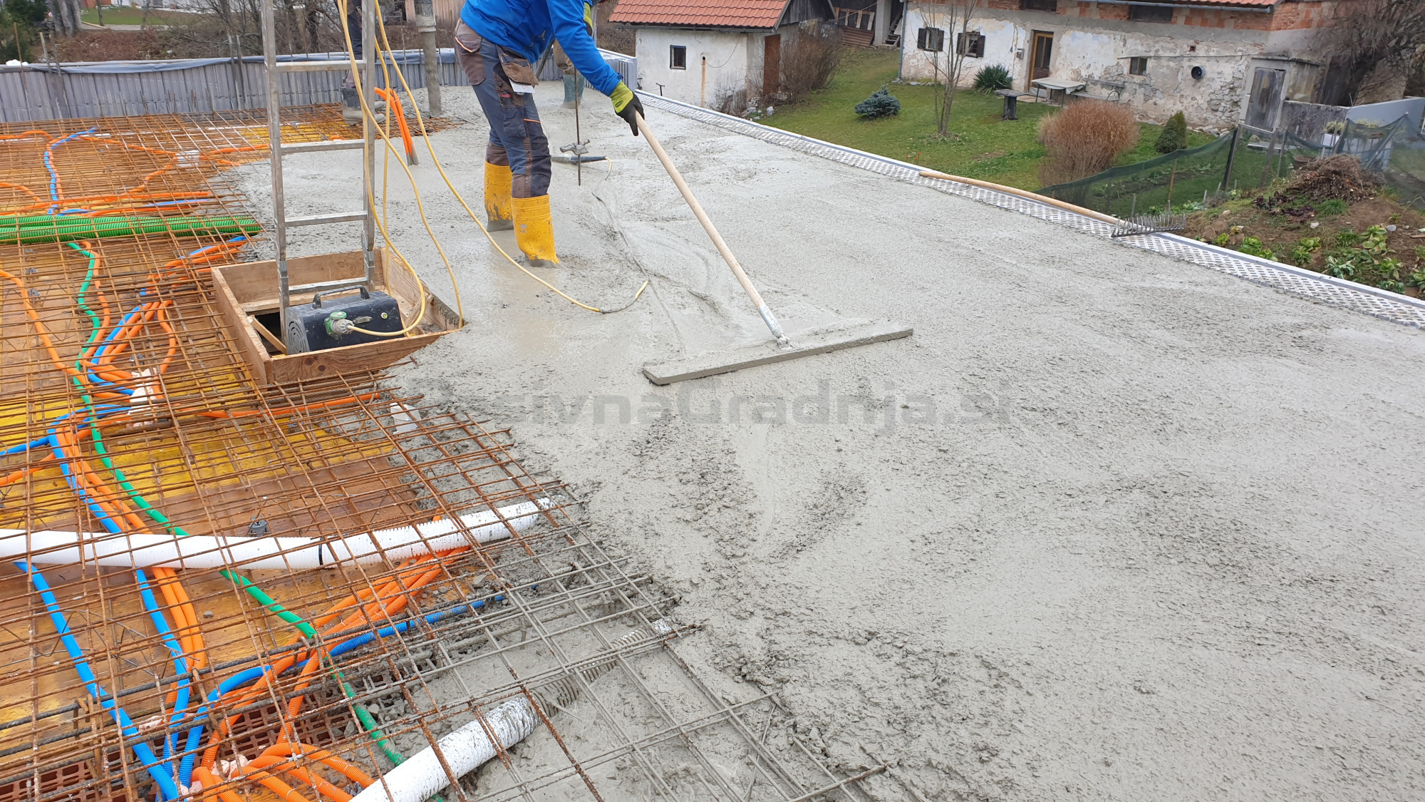 Pri betoniranju plošče je pomembno, da se sproti uporablja vibrator in da se vrši grobo niveliranje plošče ob samem betoniranju. Ker imamo v plošči precej inštalacij, je primerno vibriranje še posebej pomembno, da bo beton res oblil spodnjo cono armature, ki prevzame nateg. Ob ravnanju plošče z letvijo se ploščo še grobo izravna z letvijo na vlek, ki jo približno zagladi. Mi jo bomo pa seveda še dodatno strojno zalikali, da zapremo zgornjo površino in bo bistveno bolj kvaliteten izdelek. Pri strojno zaglajeni plošči je tudi negovanje betona po betoniranju bolj enostavno, obenem pa dobimo gladko površino za kasnejšo izvedbo parne zapore.