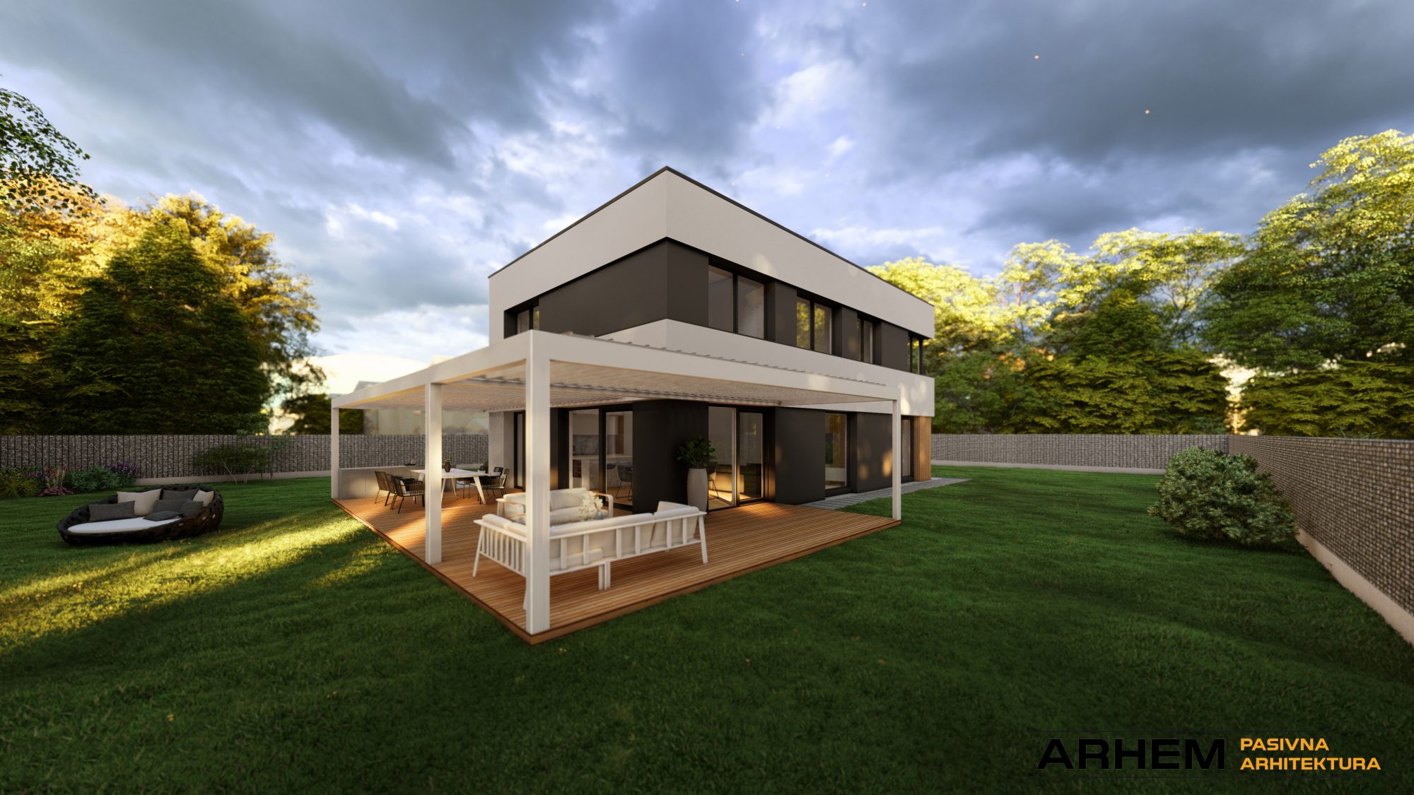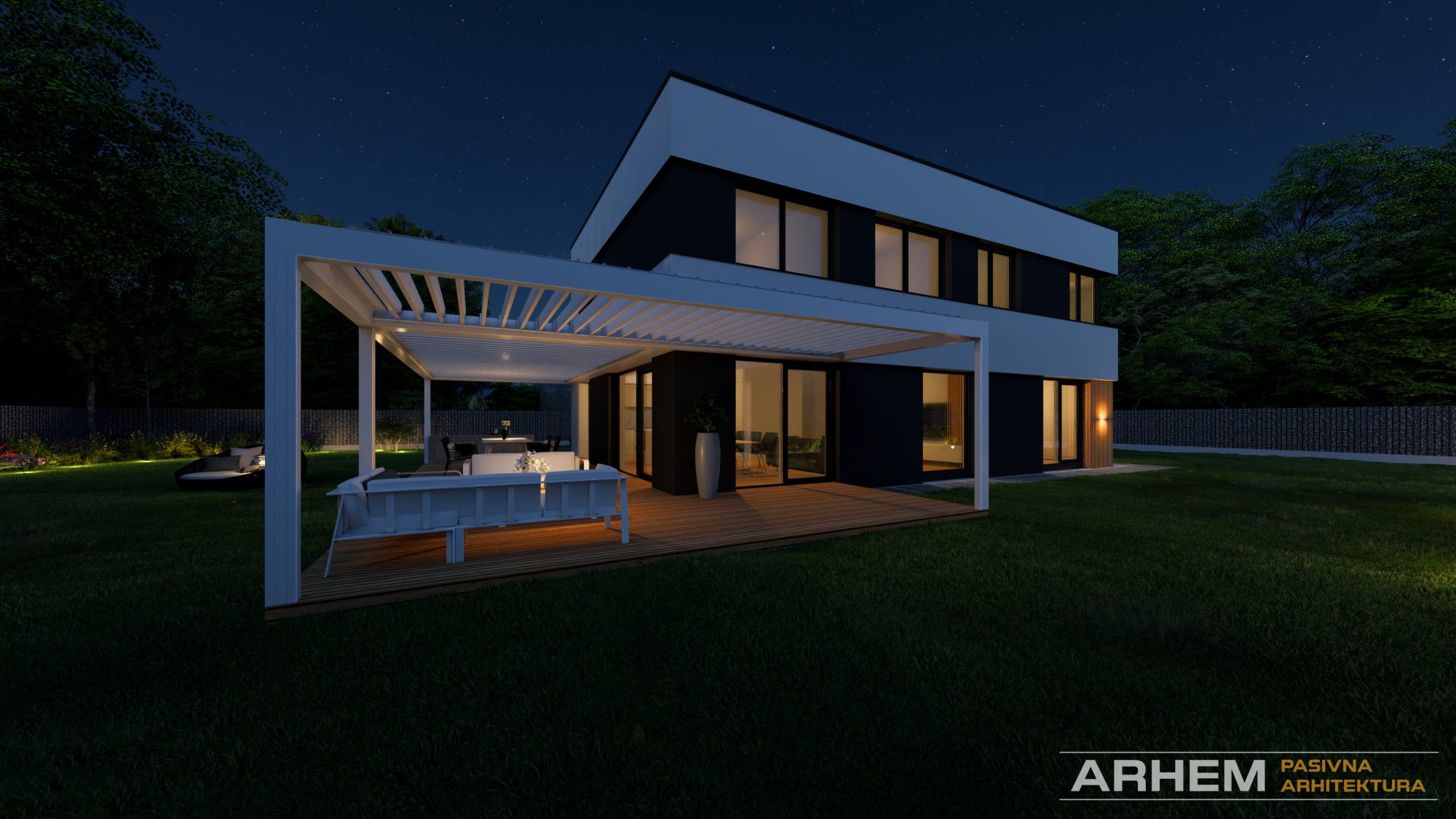 Hiša je zasnovana po načelih pasivne gradnje: kompaktna oblika, optimalna orientacija in kontrolirano prezračevanje z rekuperacijo zagotavljajo visoko energijsko učinkovitost ter stalno svež zrak. Velike zasteklitve na južni strani v prostor pripeljejo veliko dnevne svetlobe, poleti pa udobje varuje zunanje senčenje — nadkrita terasa z bioklimatsko pergolo ustvari podaljšek dnevnega prostora in omogoča kvalitetno bivanje na prostem večji del leta.