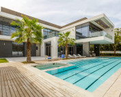 Odprti dnevni prostori se poleti razširijo na veliko pritlično teraso z bazenom, v nadstropju pa zasebne spalnice z lastnimi izhodi na terase ponujajo intimo in razgled. Dolgi napušči in natančno načrtovane linije senčenja ustvarjajo prijetno mikroklimo ter varujejo steklene površine pred vremenskimi vplivi.