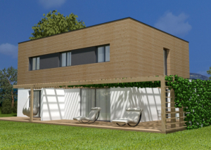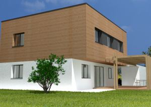Pasivna hiša L&B – Ljubljana Projekt obravnava izvedbo Pasivne hiše v gabaritu P+N. Velikost objekta cca 160 m2. Ovoj objekta – zunanji zidovi so izvedeni z gradbenimi sistemo za gradnjo Pasivnih hiš: TermoLOGiK. Zanimiv preplet pritličja in nadstropja, ki ga ponazarjata dva kubusa. Želja je bila, da ima objekt tudi nadkriti parking za dve vozili, ki je takoj ob vhodu v objekt. Parcela objekta je relativno majhna in glede na vse želje ter danosti smo redvideli opcijo, ki omogoča vkomponiranja nadstreška v objekt, ter izkoriščen prosor nad njim za teraso. V pritličju so dnevni prostori in dodatni delovni kabinet, v nadstropju pa dve otroški sobi, spalnica s svojo garderobo in kopalnico ter še dodatna kopalnica za otroke. Kubusna razgibanost omogoča tudi delno nadkritje zunanjega dela, kjer je letna kuhinja s konzolo nadstropja.