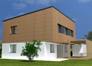 Pasivna hiša s kletjo v sklopu termičnega ovoja objekta in nadstreškom, ki je izločen iz termičnega ovoja. Projekt in izvedba pasivne hiše.